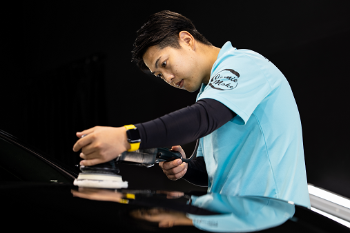 コーティングの持ちと仕上がりの綺麗さは、コーティング前の下地づくりが重要となり、ここが職人としての腕の見せ所です。下地づくり前に車体のキズを見極め、徹底的に磨くことでコーティング剤をより密着させることができ、持ちと深い艶へと導きます。